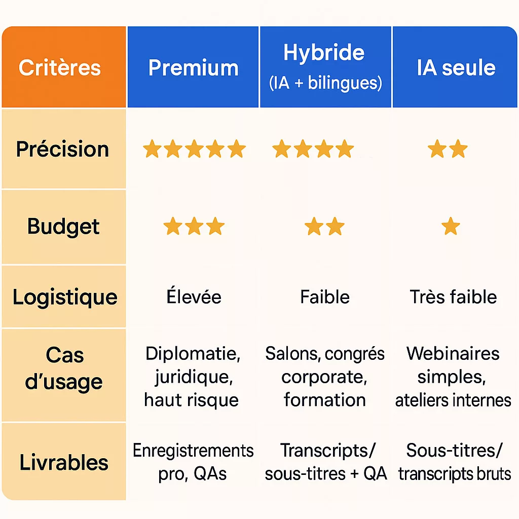- Solution évolutive : commencez en douceur avec l’IA seule pour les sessions simples, ajoutez des interprètes bilingues pour les moments clés ou passez à une interprétation premium complète pour les événements importants.